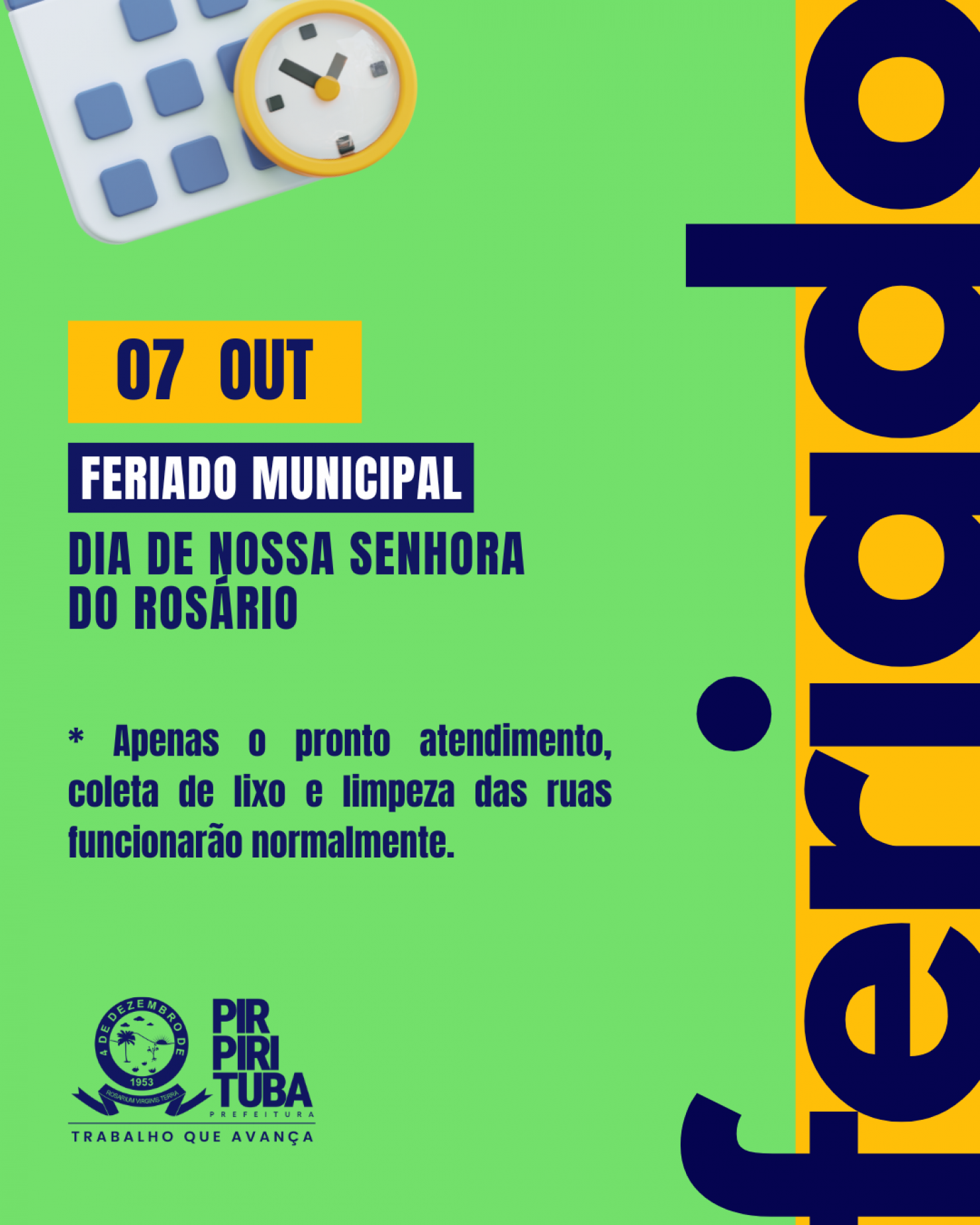A Prefeitura de Pirpirituba informa que, em conformidade com a Lei Municipal nº 014/2002, será feriado municipal nesta terça-feira, 07 de Outubro, em homenagem à Nossa Senhora do Rosário, padroeira do município.
