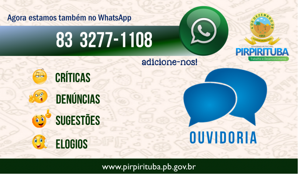 Dando prosseguimento as ações de implantação do serviço de Ouvidoria, a Prefeitura de Pirpirituba passa a disponibilizar o canal direto com a população através do WhatsApp.