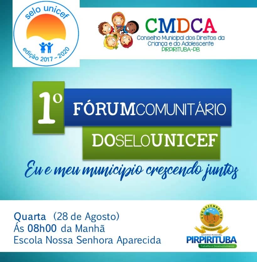 O Conselho Municipal dos Direitos da Criança e do Adolescente de Pirpirituba-PB (CMDCA) e a Comissão Intersetorial Pelos Direitos da Infância e Adolescência, com apoio da Prefeitura Municipal de Pirpirituba, realizará o 1º Fórum Comunitário do Selo UNICEF, na terça-feira (28/08), às 08:00h, no auditório da Escola Municipal Nossa Senhora de Aparecida.