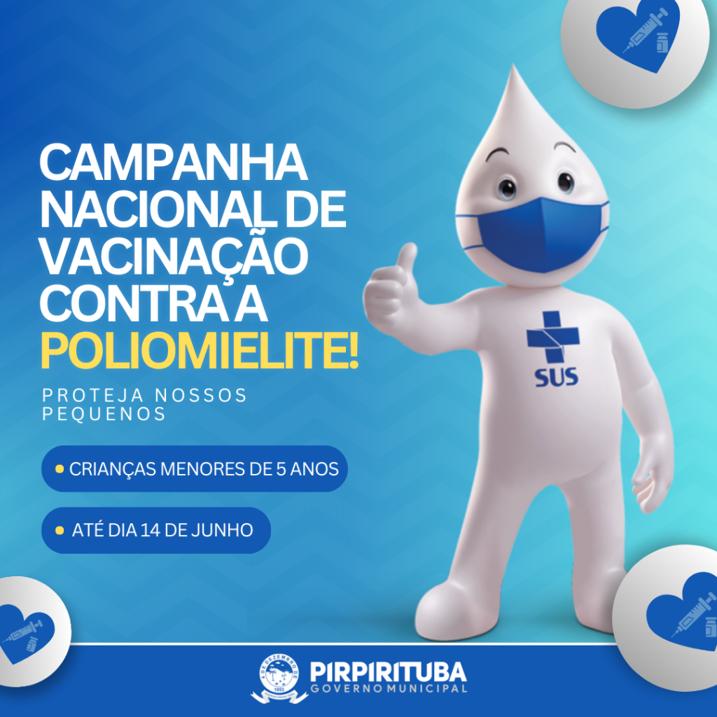 Campanha Nacional de Vacinação contra a Poliomielite para crianças menores de cinco anos, até o dia 14 de junho. O objetivo é reduzir o risco de reintrodução do poliovírus no Brasil; na tentativa da erradicação da doença. Por isso, fiquem de olho na caderneta de vacinação dos pequenos. É hora da vacina de pólio! A vacinação é a única forma de prevenção da Poliomielite. Todas as crianças menores de cinco anos de idade devem ser vacinadas conforme esquema de vacinação de rotina e na campanha nacional anual. Desde 2016, o esquema vacinal contra a poliomielite passou a ser de três doses da vacina injetável – VIP (2, 4 e 6 meses) e mais duas doses de reforço com a vacina oral bivalente – VOP (gotinha). A mudança está de acordo com a orientação da Organização Mundial da Saúde (OMS) e faz parte do processo de erradicação mundial da pólio.