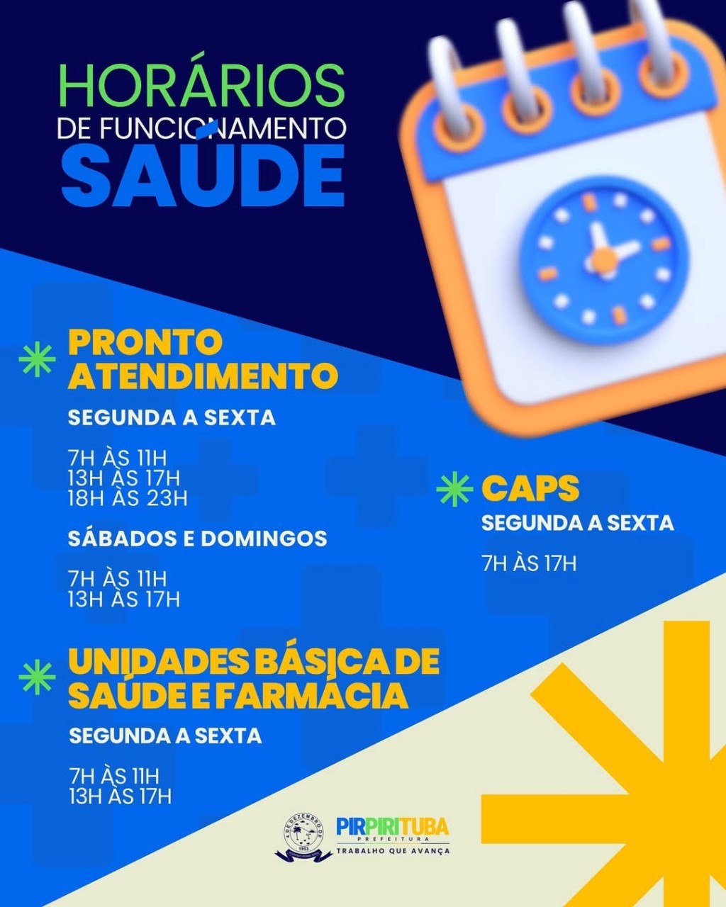 A Secretaria Municipal de Saúde (SMS) de Pirpirituba comunica, considerando a essencialidade e relevância dos serviços prestados pela rede de saúde do município, os horários de funcionamento dos serviços oferecidos à população.