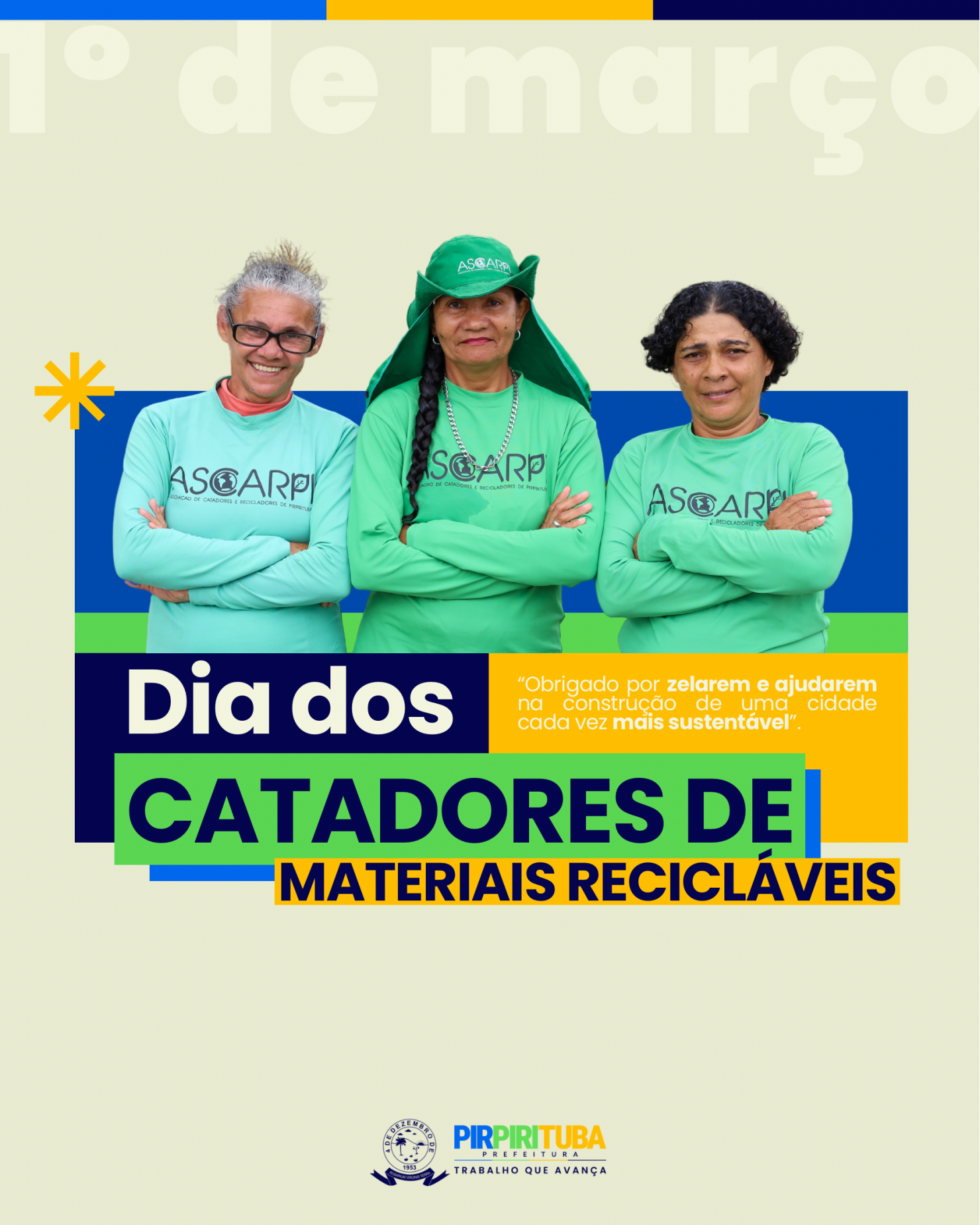 Hoje, 1º de março é comemorado o Dia Mundial dos Catadores de Materiais Recicláveis, a data foi escolhida em memória de um massacre ocorrido na Colômbia em 1992, onde morreram, brutalmente assassinados, 11 catadores. Em nome da Prefeitura Municipal de Pirpirituba, parabenizamos e agradecemos a todos esses trabalhadores por todo serviço prestado não só em favor de nossa cidade, mas também na contribuição que essas práticas impactam o meio ambiente. A Associação dos Catadores e Recicladores de Pirpirituba - ASCARP sediada no nosso município, luta pela limpeza da nossa cidade, para diminuir a poluição do meio ambiente, buscando a reciclagem dos materiais recolhidos. Com a reciclagem, evitamos que muitos desses materiais fiquem jogados em terrenos e espaços indevidos, além de muitos recursos naturais não renováveis serem poupados, dentre eles a água e o petróleo, principal matéria-prima da produção de embalagens plásticas.