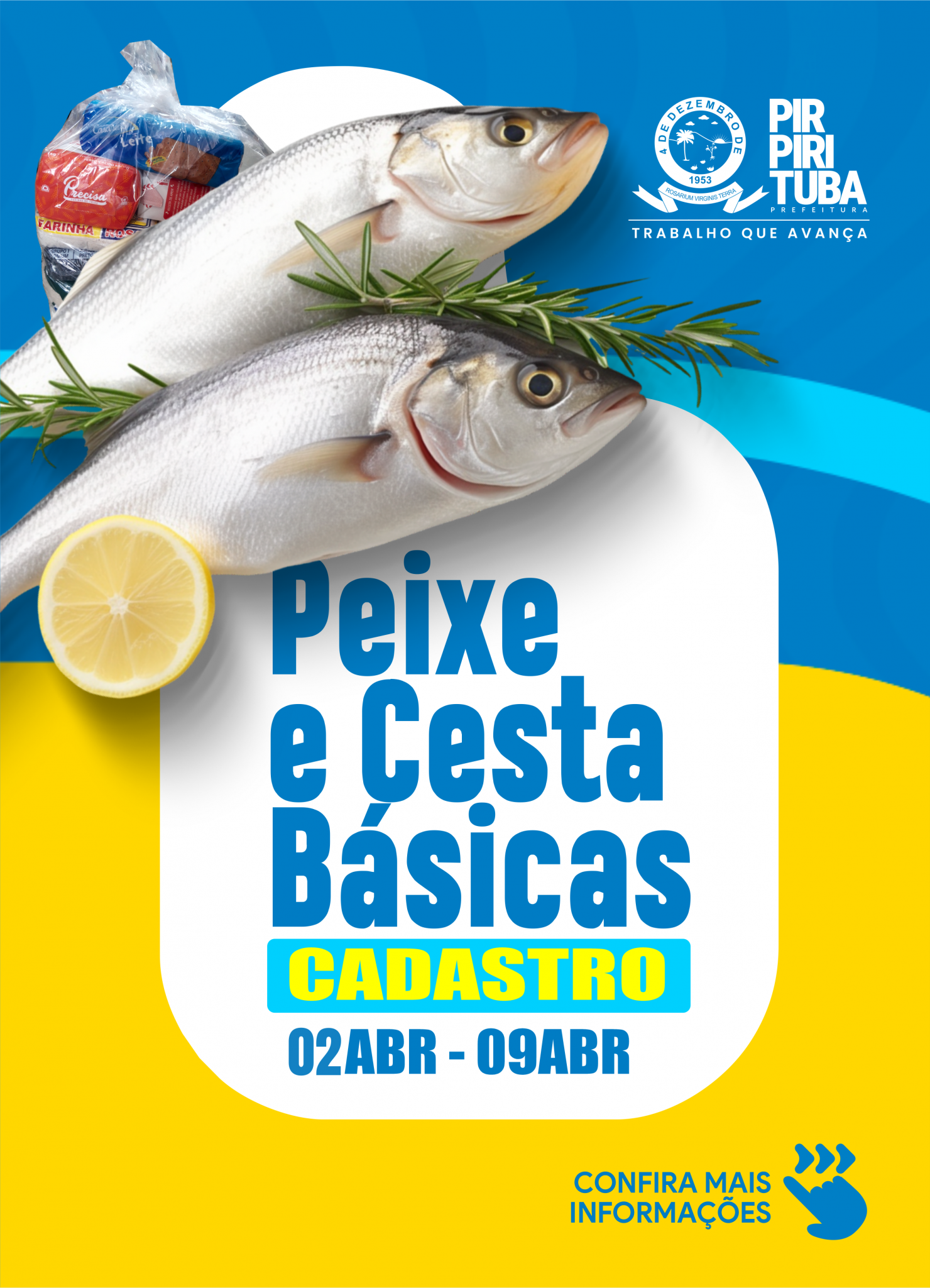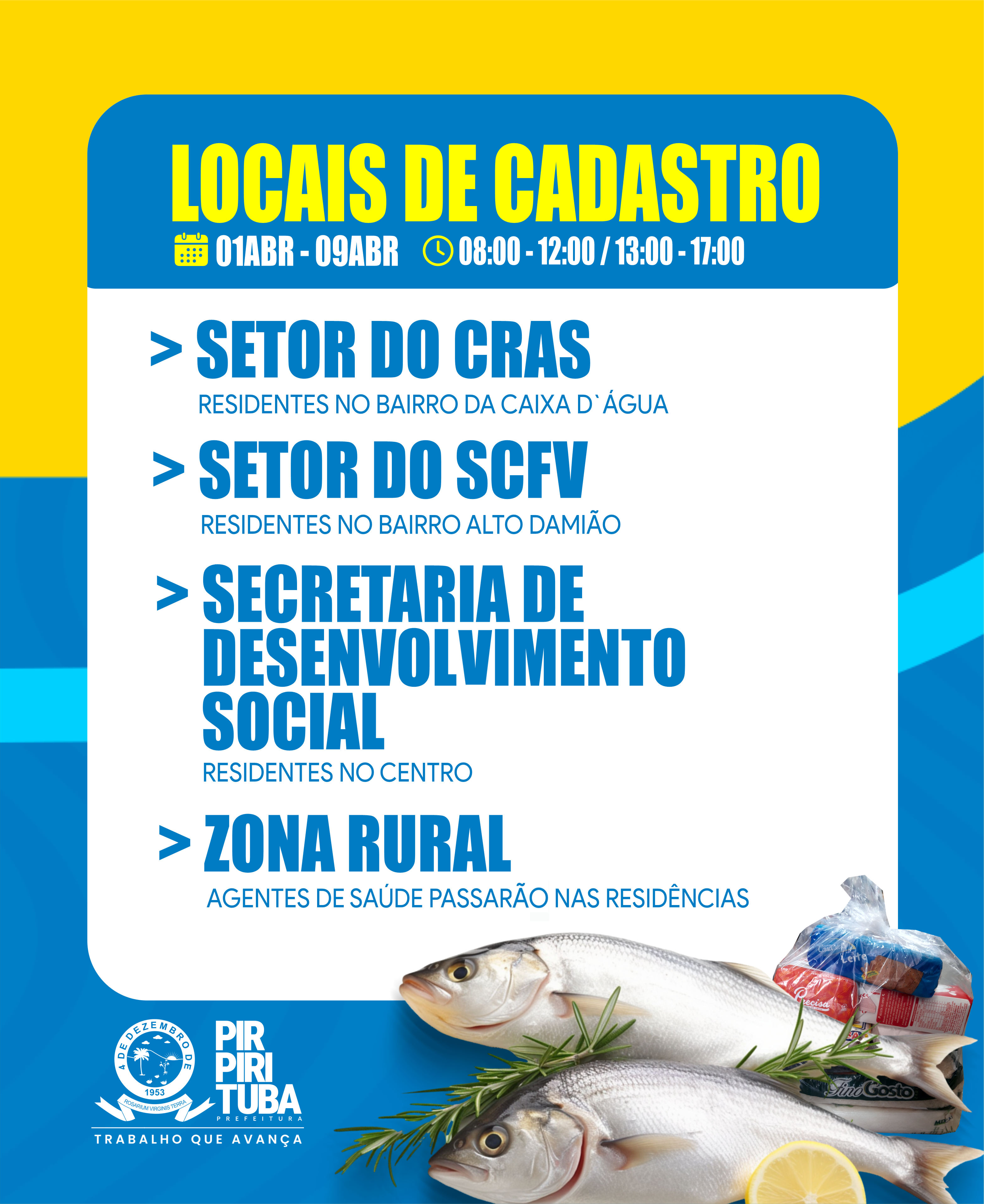 A Prefeitura de Pirpirituba, através da Secretaria de Desenvolvimento Social, informa a todas as pessoas inscritas no Cadastro Único e Programa Bolsa Família, que estará realizando o cadastramento para recebimento do peixe e cesta básica para o período da Semana Santa. Os Documentos necessários para o cadastramento são RG e NIS e comprovante de residência. O cadastro será realizado durante os dias 02 à 09 de Abril, com início de 08h às 12h e de 13h às 17h e acontecerá da seguinte forma: