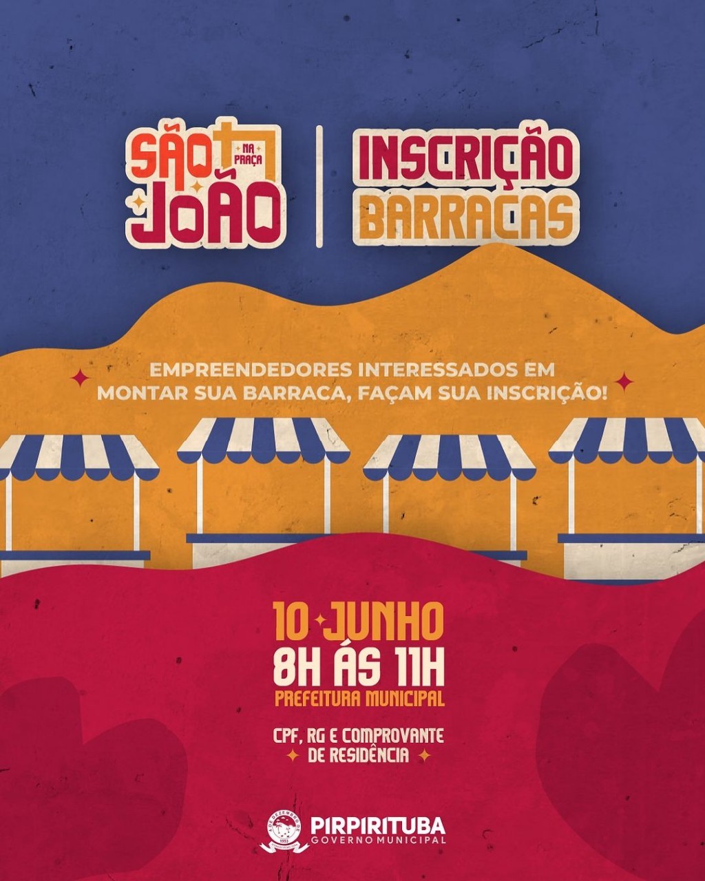 A prefeitura municipal de Pirpirituba comunica que na próxima segunda-feira (10) será realizado as inscrições para empreendedores que queiram comercializar seus produtos no São João na Praça. A inscrição acontecerá das 8h às 11h, na sede da prefeitura (sala de Cultura e Turismo) R. Prof. Félix Cantalice, 133 - Centro, Pirpirituba - PB, 58213-000. Não esqueça de levar CPF, RG e comprovante de residência. A festa irá acontecer nos dias 22,23 e 24 de Junho.