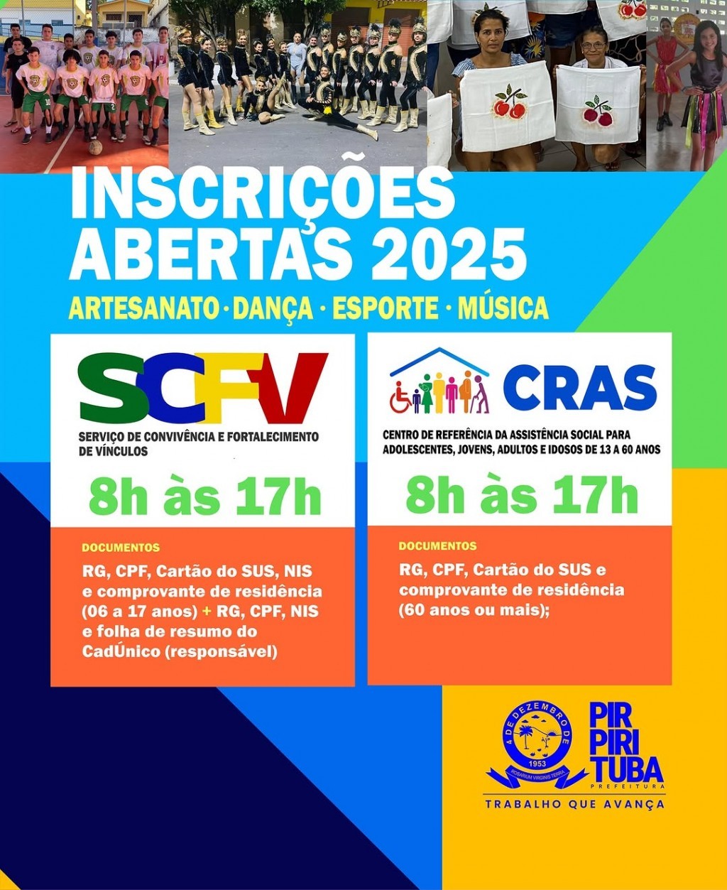 A Secretaria de Desenvolvimento Social através do Centro de Referência da Assistência Social (CRAS) e o Serviço de Convivência e Fortalecimento de Vínculos (SCFV), abriu as inscrições para as atividades deste ano de 2025. As inscrições são gratuitas e poderão ser feitas de segunda a sexta-feira, das 8h às 17h, no Serviço de Convivência e Fortalecimento de Vínculos (SCFV) para as crianças de 6 a 13 anos e no CRAS – Centro de Referência da Assistência Social Para adolescentes, jovens, adultos e idosos de 13 a 60 anos; interessados em desenvolver habilidades de artesanato, dança, esporte e música.