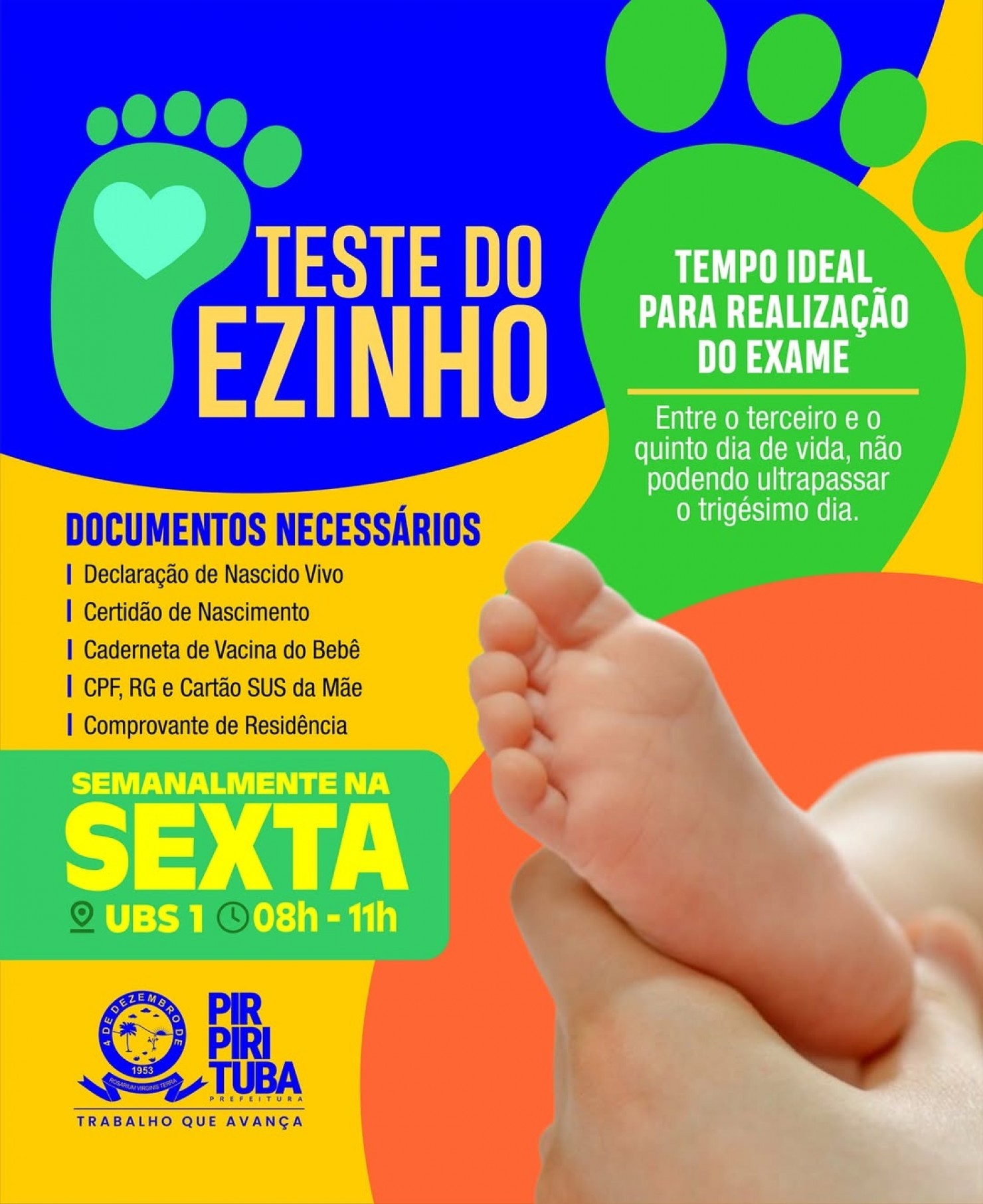 A Prefeitura Municipal de Pirpirituba através da secretaria de saúde oferece à população o um espaço dedicado a realização do exame do teste do pezinho, fazendo com que a população tenha acesso a esse serviço de forma gratuita em sua própria Cidade. O Teste do Pezinho nada mais é do que um exame que tira gotinhas de sangue do calcanhar do bebê e ajuda a descobrir doenças graves, que não têm sintomas logo após o nascimento. O serviço acontece todas as sextas-feiras das 08 às 11h na UBS I, Rua José Cruz. Fique atento a documentação necessária: