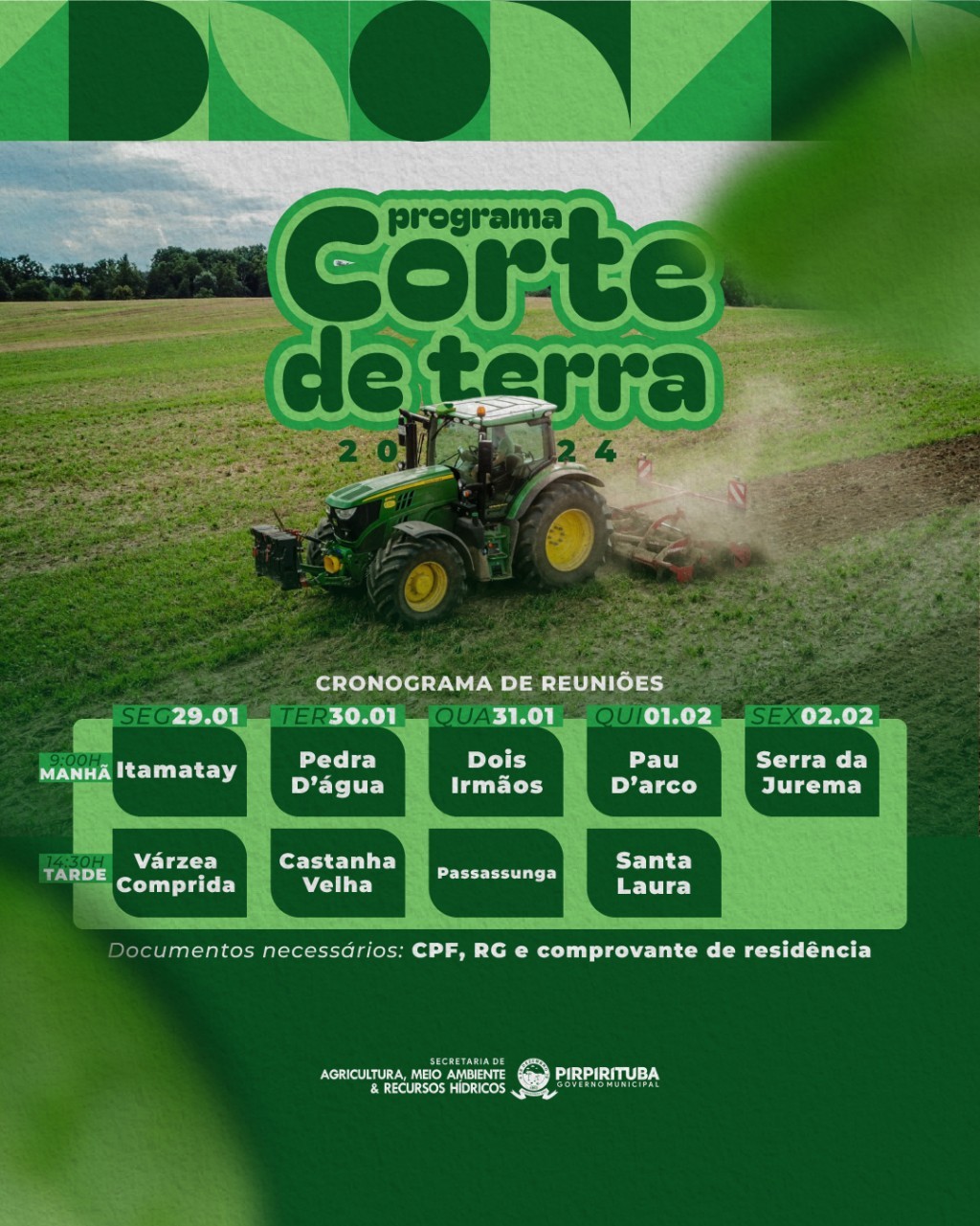 A Prefeitura Municipal de Pirpirituba, através da Secretaria de Agricultura, Meio Ambiente e Recursos Hídricos, divulgou o cronograma de reuniões para o início dos serviços de corte de terra para os agricultores do município. As reuniões terão início a partir desta segunda-feira dia 29, e vão até o dia 02 de Fevereiro. Fique atento aos documentos necessários: CPF, RG e comprovante de residência.