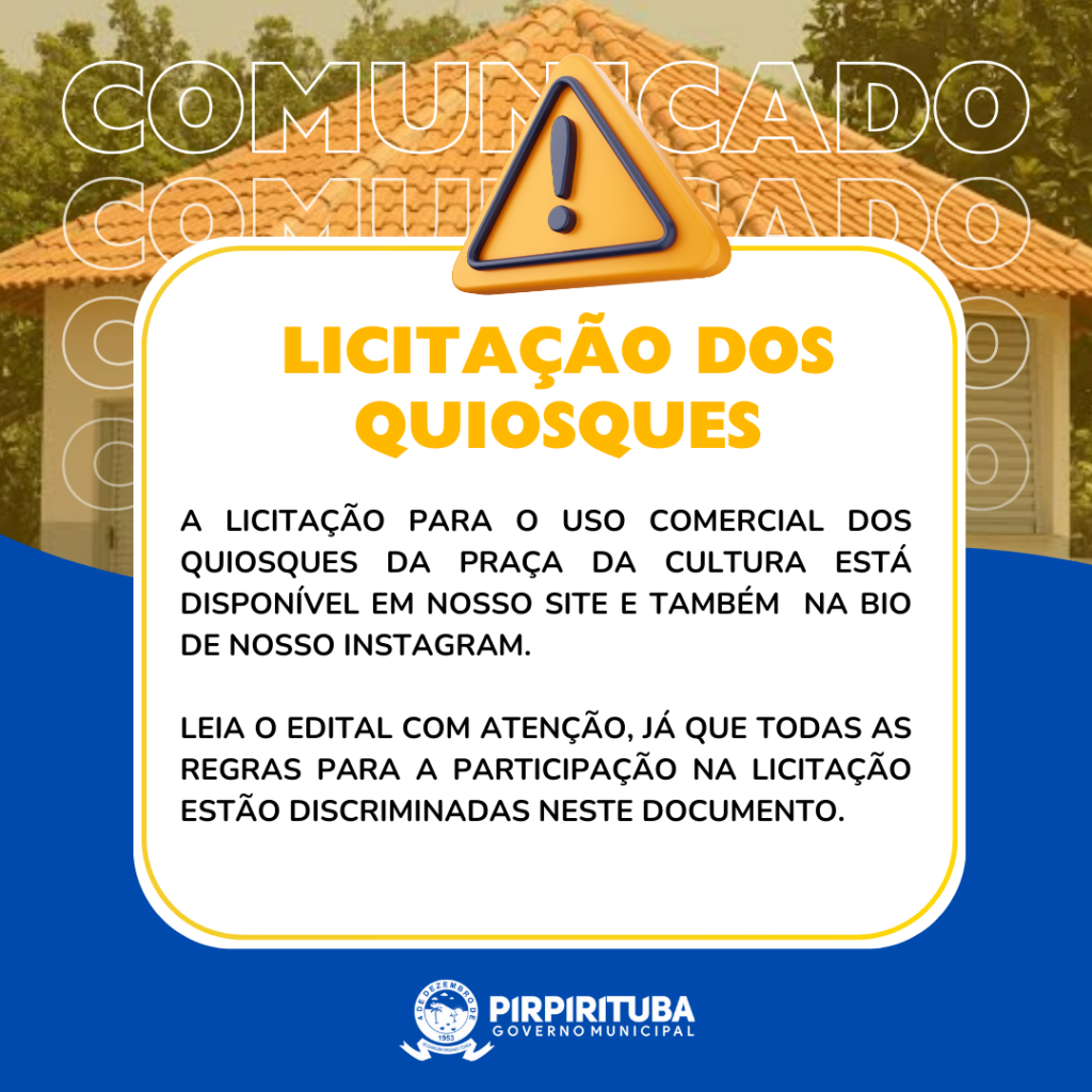 A prefeitura Municipal de Pirpirituba torna público que realizará através do Agente de Contratação e Equipe de Apoio, sediada na Rua Felix Cantalice, 133 - Centro - Pirpirituba - PB, por meio do site www.portaldecompraspublicas.com.br, licitação modalidade Concorrência, do tipo maior lance, para: A Concessão de 02 (Dois) Espaços Públicos, do Tipo Quiosques, para Fins de Exploração Comercial Lanchonete/restaurante, Conforme o Termo de Referência - Anexo I deste Instrumento Convocatório. Abertura da sessão pública: 14:00 horas do dia 26 de dezembro de 2024. Início da fase de lances: para ocorrer nessa mesma sessão pública. Referência: horário de Brasília - DF. Recursos: previstos no orçamento vigente. Fundamento legal: Lei Federal nº 14.133/21; Lei Complementar nº 123/06; Instrução Normativa nº 73 SEGES/ME/22; e legislação pertinente, consideradas as alterações posteriores das referidas normas. Informações: das 08:00 Às 12:00 e de 13:00 Às 17:00 horas dos dias úteis, no endereço supracitado. Telefone: (83) 3277-1108. E-mail: licitacao.pirpirituba@gmail.com. Edital: http://www.pirpirituba.pb.gov.br/; www.tce.pb.gov.br; www.portaldecompraspublicas.com.br. Leia atentamente todas as informações descriminadas através desse link: Clique aqui e saiba mais
