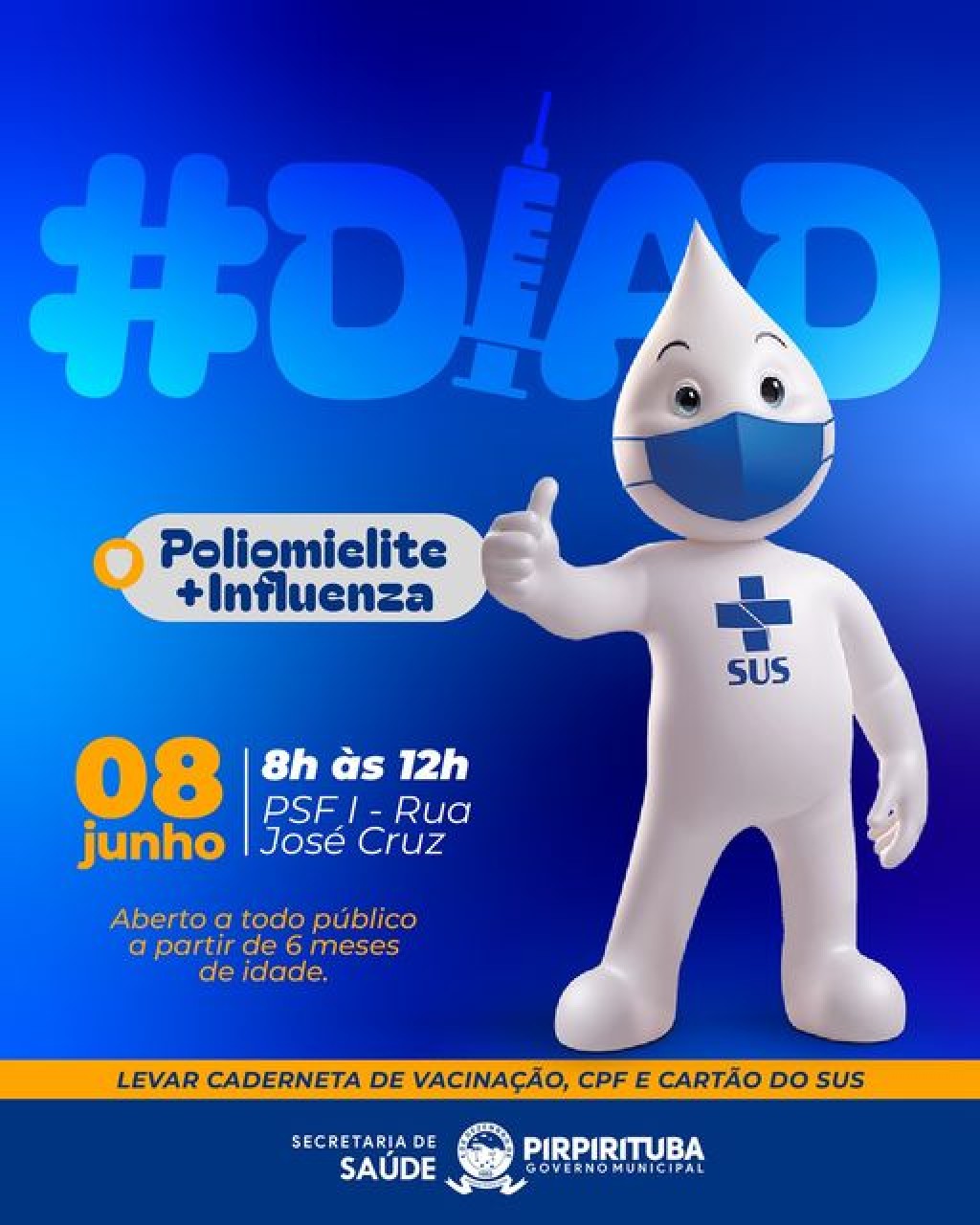Neste sábado, 8 de Junho, teremos o dia D de multivacinação, com atualização da caderneta e com foco na vacina da Poliomielite e influenza. A vacinação irá acontecer na unidade básica de saúde 1, localizado na rua José Cruz, das 8h às 12h. Não esqueça de levar a caderneta de vacinação, CPF e cartão do SUS. Não deixe de se vacinar! ![]()