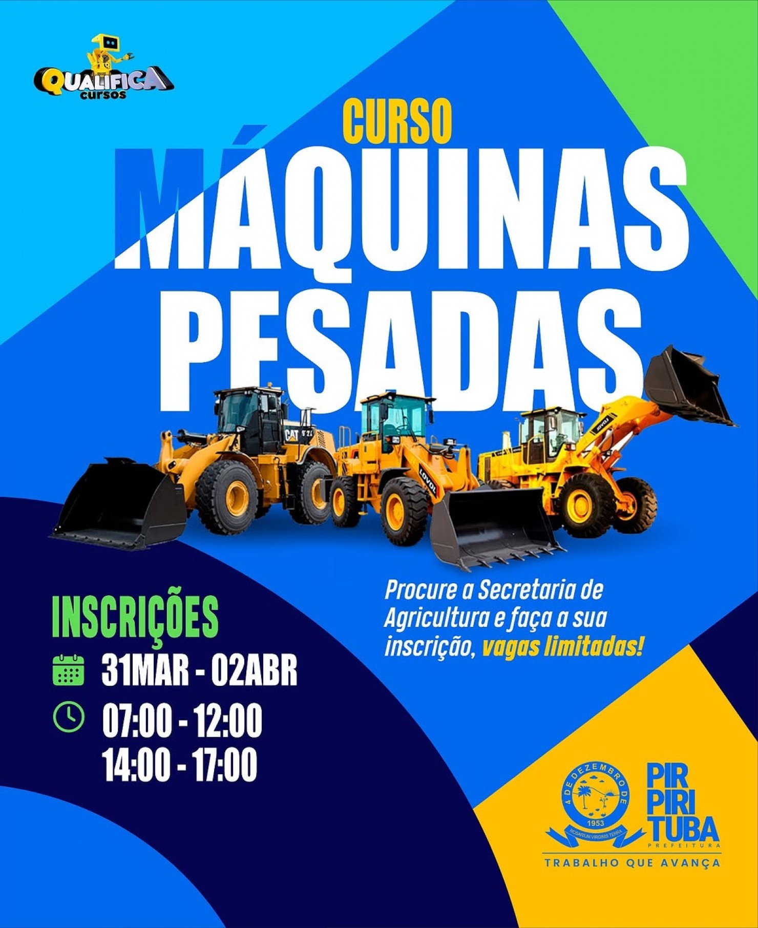 A Prefeitura de Pirpirituba, em parceria com a empresa Qualifica Cursos, anuncia uma grande oportunidade para os moradores do município! Estão abertas as inscrições para o Curso de Máquinas Pesadas. O curso totalmente gratuito, visa capacitar profissionais para o mercado de trabalho, oferecendo aprendizado teórico e prático sobre o manuseio de equipamentos pesados. Os participantes terão acesso a um treinamento completo, que inclui aulas teóricas e práticas sobre o funcionamento e a operação segura de máquinas pesadas. Além da apostila gratuita os alunos irão receber um certificado ao final da capacitação. Essa é uma excelente oportunidade para quem busca qualificação e novas perspectivas profissionais na área da construção civil e agrícola.