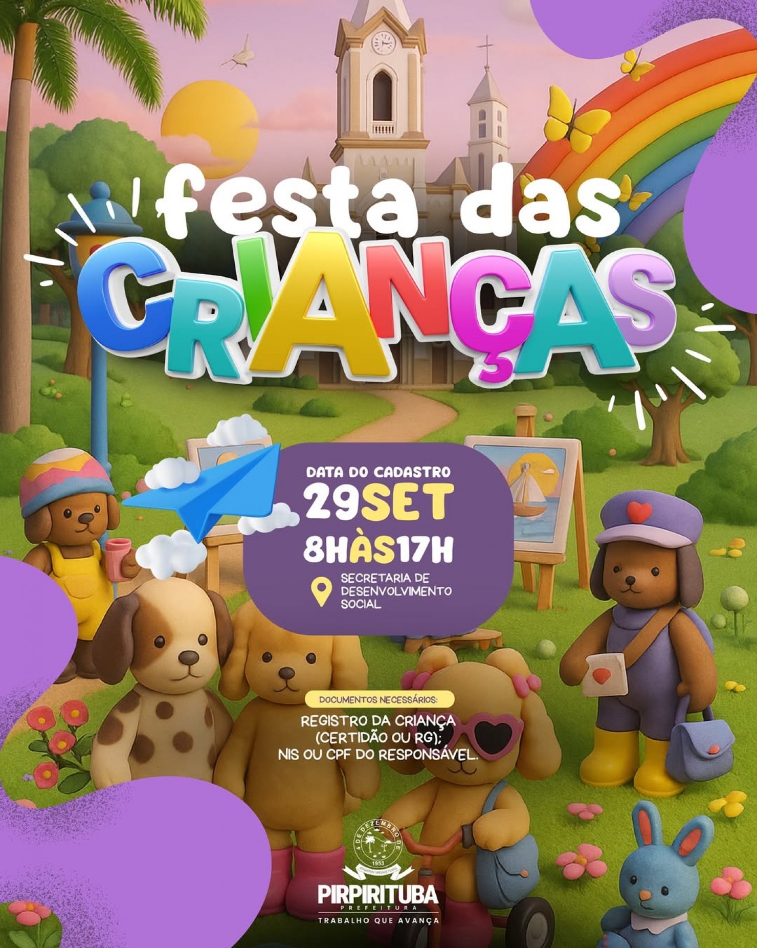 A Prefeitura de Pirpirituba, por meio da Secretaria de Desenvolvimento Social, está realizando o cadastro de crianças para participação da Festa do Dia das Crianças. O prazo para realizar o cadastro vai até o dia 03 de outubro. O evento é voltado para crianças do município com idade entre 1 e 12 anos e tem como objetivo garantir um momento especial de lazer, brincadeiras, distribuição de brinquedos, guloseimas e muita diversão em comemoração ao Dia das Crianças.