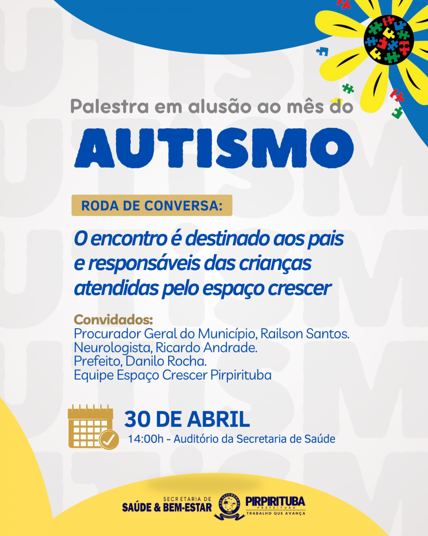 A prefeitura Municipal de Pirpirituba através da secretaria de Saúde e Bem estar irá realizar neste dia 30 de Abril a partir das 14h uma palestra em alusão ao mês do autismo. A palestra tem como público alvo pais e responsáveis das crianças que são entendidas no espaço crescer. O encontro contará com a presença do Procurador Geral do município, Railson Santos, Prefeito, Danilo Rocha, Neurologista, Ricardo Andrade e a equipe do Espaço Crescer.